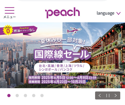 ピーチ国際線6/8(日)迄セール中(成田-台北8990円~など)コロナ禍明け最安値か?