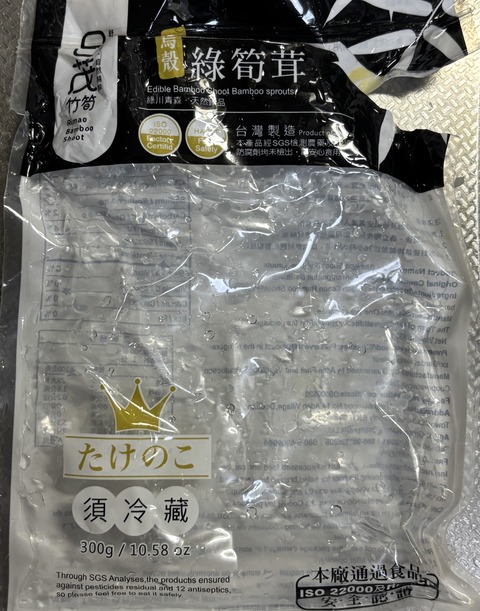 台湾の熱炒で食べる涼筍沙拉(タケノコサラダ)が大好きで、度々台湾のスーパーで水煮タケノコを購入して帰国するが、このパッケージはおそらく初めて···