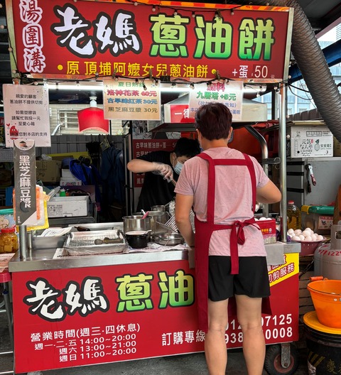 湯囲溝温泉公園のドクターフィッシュ店が並ぶ一画にある屋台「老媽葱油餅」へ。親分がチェックしていたお店で、タイミングによっては行列になっている···