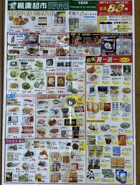 2025年9月に行った台湾のスーパー「楓康超市」でもらって来た広告。台湾で目にする機会が多い「買一送一」は、「ひとつ買うともうひとつもらえる」と···