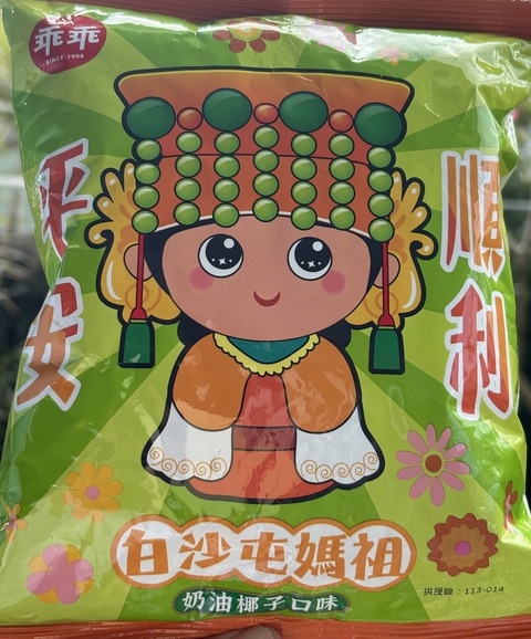 台湾の二大媽祖進香行事で有名な「白沙屯拱天宮」へ行った際、廟の横のセブンイレブンで、ジャケ買いしたお菓子がある。それがこちら↑。白沙屯媽祖が···