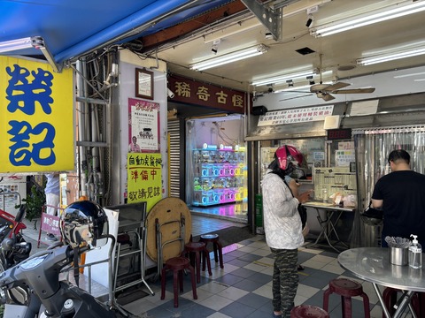 最終日の昼食にやって来たのは、2回目の訪問「榮記客家粄條(榮記客家湯圓)」。柱に「自動点餐機準備中(発券機準備中)」の紙が貼られているので近···